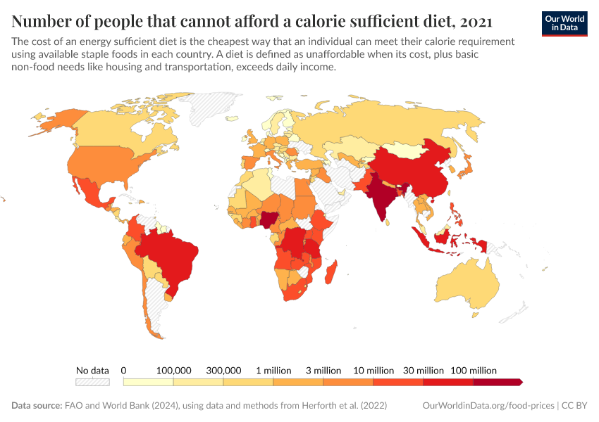 By comparing the cost of diets with income distributions across the world, researchers estimated that 1.1 billion people could not afford the most basic energy sufficient diet in 2021. That’s 14% of the global population.7 These are the very worst-off in terms of nutrition.