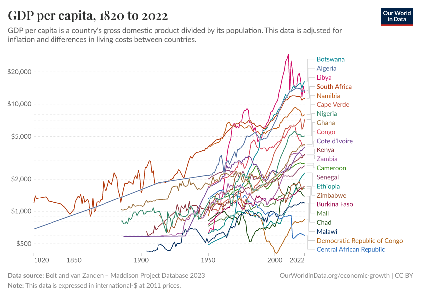 For Africa, we have fewer historical estimates. As shown in the second chart, within the Maddison Project Database, estimates prior to 1950 are only available for a small number of countries.