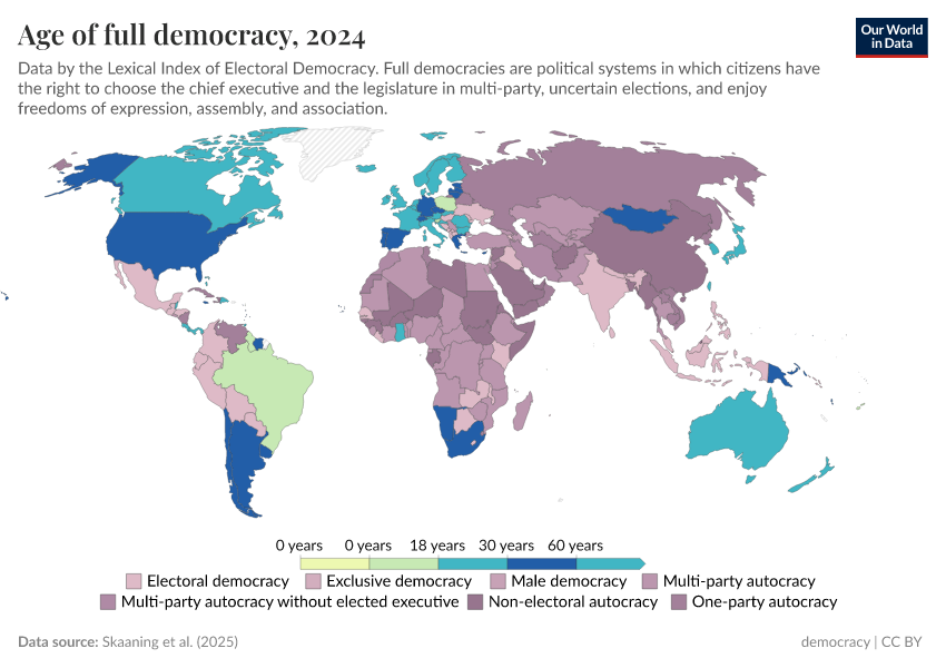 Skaaning et al. (2024) – processed by Our World in Data. “Age of full democracy” [dataset]. Skaaning et al., “Lexical Index of Electoral Democracy (LIED) v6.6” [original data]. Retrieved June 5, 2025 from https://wdi-citations.owid.pages.dev/grapher/age-of-full-democracy