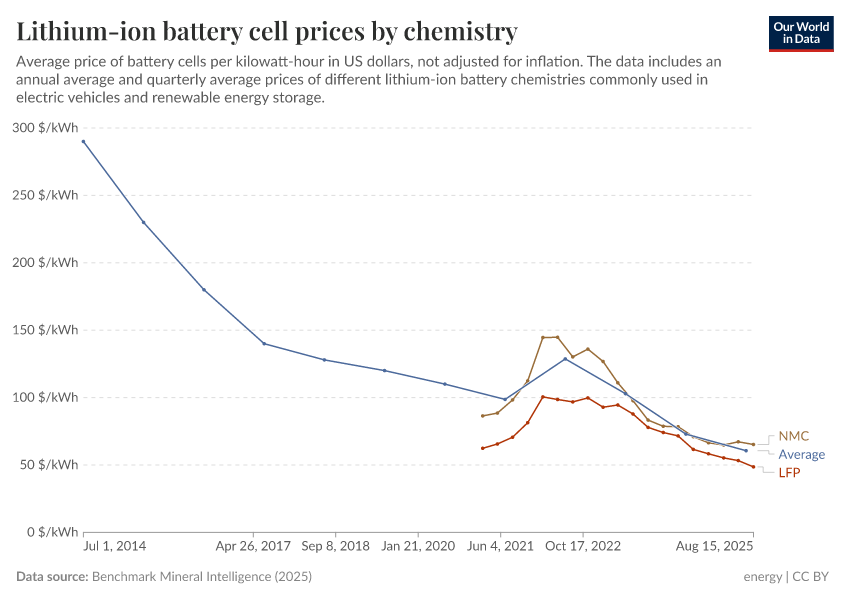 Benchmark Mineral Intelligence (2024) – with minor processing by Our World in Data. “Lithium ion battery cell price” [dataset]. Benchmark Mineral Intelligence, “Lithium ion batteries prices”; Benchmark Mineral Intelligence, “Batteries prices by chemistry” [original data]. Retrieved June 5, 2025 from https://wdi-citations.owid.pages.dev/grapher/average-battery-cell-price