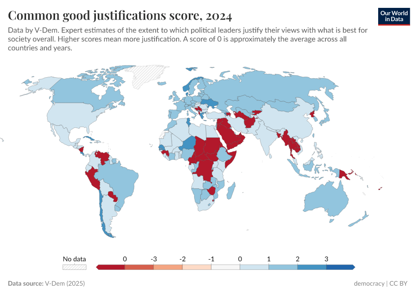 “Data Page: Common good justifications”, part of the following publication: Bastian Herre, Lucas Rodés-Guirao, and Esteban Ortiz-Ospina (2013) - “Democracy”. Data adapted from V-Dem. Retrieved from https://wdi-citations.owid.pages.dev/grapher/common-good-justifications-score [online resource]How to cite this data