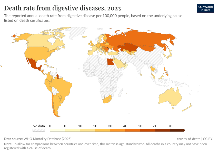 WHO Mortality Database (2024) – with minor processing by Our World in Data. “Death rate from digestive diseases” [dataset]. WHO Mortality Database, “WHO Mortality Database” [original data]. Retrieved June 5, 2025 from https://wdi-citations.owid.pages.dev/grapher/death-rate-from-digestive-diseases-who-mdb