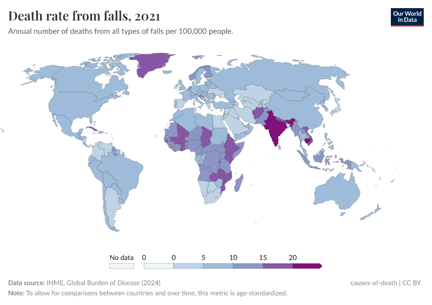 IHME, Global Burden of Disease (2024) – with minor processing by Our World in Data. “Death rate from falls” [dataset]. IHME, Global Burden of Disease, “Global Burden of Disease - Deaths and DALYs” [original data]. Retrieved June 5, 2025 from https://wdi-citations.owid.pages.dev/grapher/death-rate-from-falls-gbd