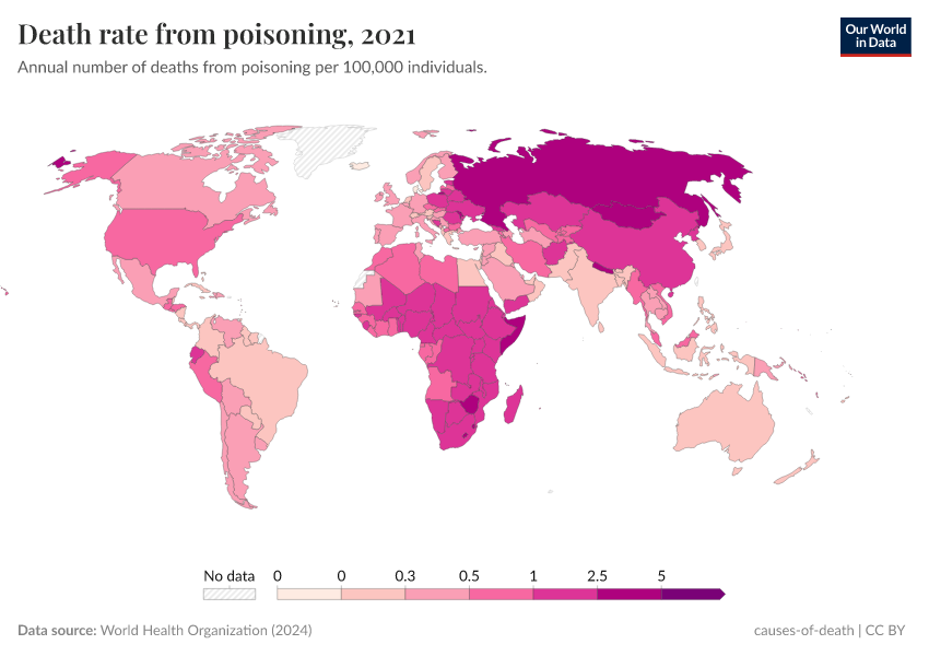 World Health Organization (2024) – with major processing by Our World in Data. “Death rate from poisoning” [dataset]. World Health Organization, “Global Health Estimates” [original data]. Retrieved June 5, 2025 from https://wdi-citations.owid.pages.dev/grapher/death-rate-from-poisoning-ghe