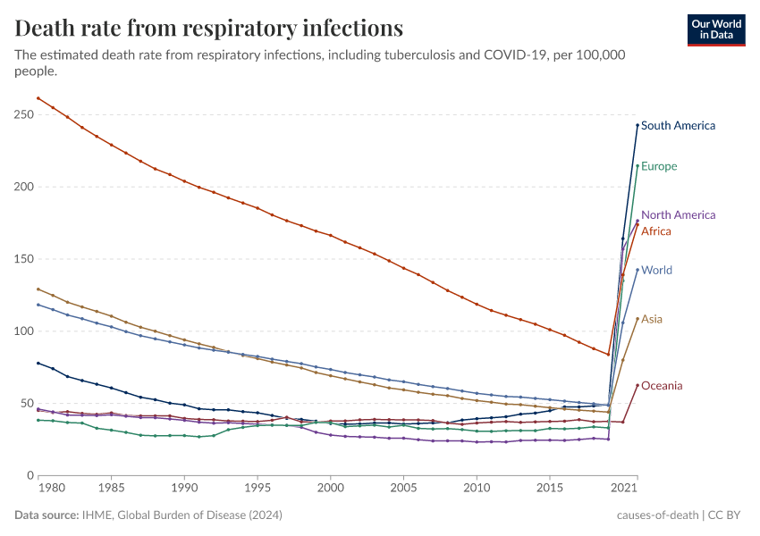 IHME, Global Burden of Disease (2024) – with minor processing by Our World in Data. “Death rate from respiratory infections” [dataset]. IHME, Global Burden of Disease, “Global Burden of Disease - Deaths and DALYs” [original data]. Retrieved June 5, 2025 from https://wdi-citations.owid.pages.dev/grapher/death-rate-from-respiratory-infections-gbd