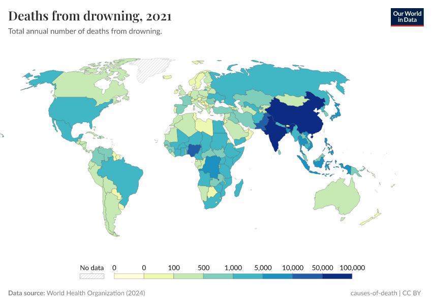 World Health Organization (2024) – with major processing by Our World in Data. “Deaths from drowning” [dataset]. World Health Organization, “Global Health Estimates” [original data]. Retrieved June 5, 2025 from https://wdi-citations.owid.pages.dev/grapher/deaths-from-drowning-ghe