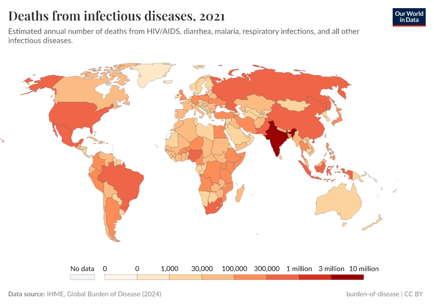 IHME, Global Burden of Disease (2024) – with minor processing by Our World in Data. “Deaths from infectious diseases” [dataset]. IHME, Global Burden of Disease, “Global Burden of Disease - Deaths and DALYs” [original data]. Retrieved June 5, 2025 from https://wdi-citations.owid.pages.dev/grapher/deaths-from-infectious-diseases