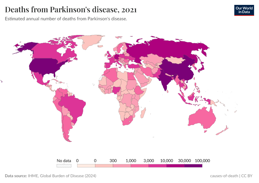 IHME, Global Burden of Disease (2024) – with minor processing by Our World in Data. “Deaths from Parkinson's disease” [dataset]. IHME, Global Burden of Disease, “Global Burden of Disease - Deaths and DALYs” [original data]. Retrieved June 5, 2025 from https://wdi-citations.owid.pages.dev/grapher/deaths-from-parkinsons-disease
