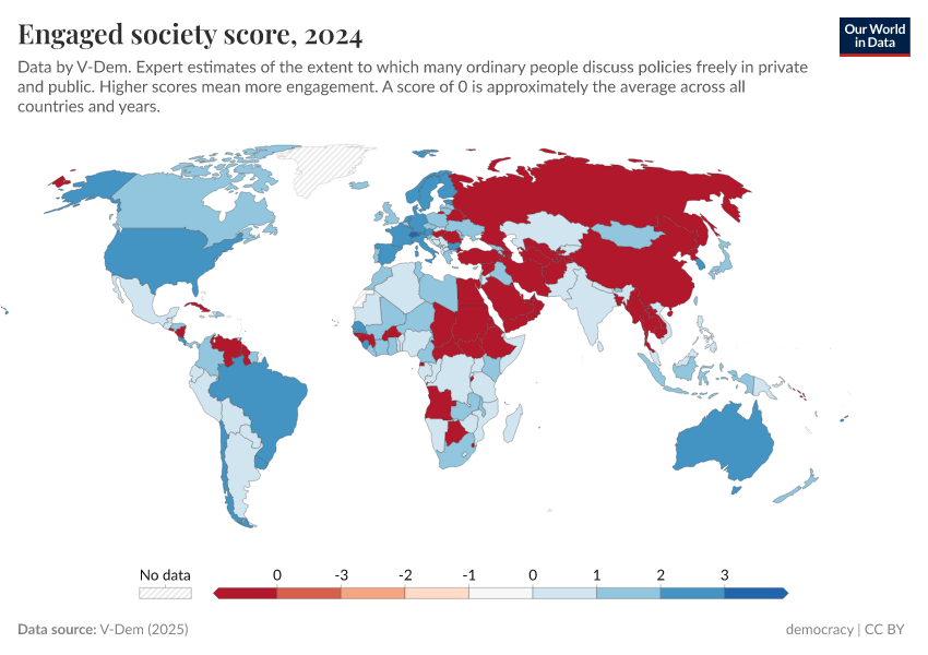 V-Dem (2025) – processed by Our World in Data. “Engaged society – V-Dem” [dataset]. V-Dem, “Democracy report v15” [original data]. Retrieved June 5, 2025 from https://wdi-citations.owid.pages.dev/grapher/engaged-society-score