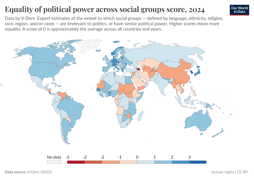 V-Dem (2025) – processed by Our World in Data. “Equality of political power across social groups – V-Dem” [dataset]. V-Dem, “Democracy report v15” [original data]. Retrieved June 5, 2025 from https://wdi-citations.owid.pages.dev/grapher/equality-of-political-power-across-social-groups-score