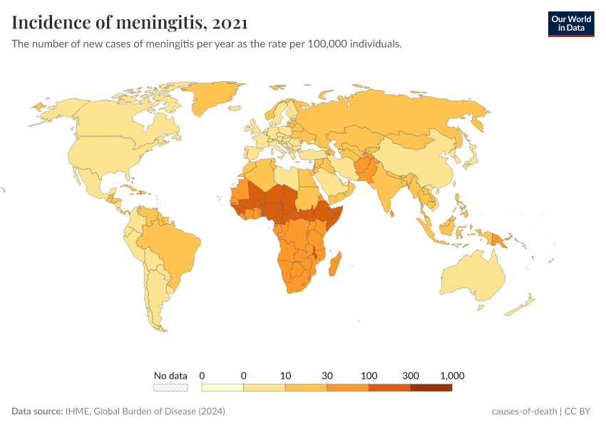 “Data Page: Incidence of meningitis”, part of the following publication: Esteban Ortiz-Ospina and Max Roser (2016) - “Global Health”. Data adapted from IHME, Global Burden of Disease. Retrieved from https://wdi-citations.owid.pages.dev/grapher/incidence-of-meningitis [online resource]How to cite this data