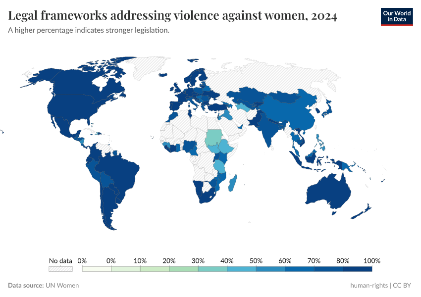 UN Women – processed by Our World in Data. “Legal frameworks addressing violence against women” [dataset]. UN Women, “UN Women” [original data]. Retrieved June 5, 2025 from https://wdi-citations.owid.pages.dev/grapher/legal-frameworks-regarding-violence-against-women