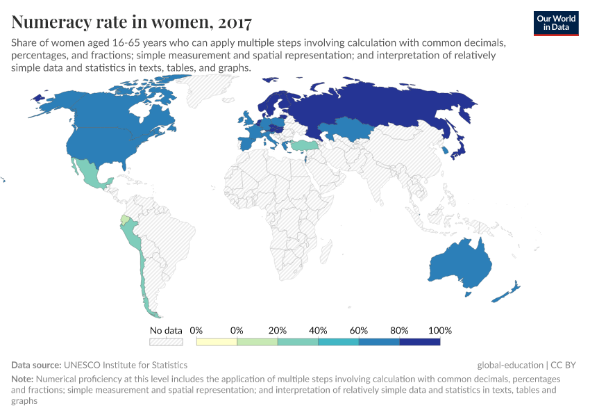 “Data Page: Numeracy rate in women”. Our World in Data (2025). Data adapted from UNESCO Institute for Statistics. Retrieved from https://wdi-citations.owid.pages.dev/grapher/numeracy-rate-in-adult-women-sdg [online resource]How to cite this data