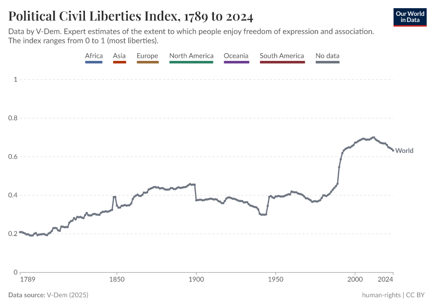 V-Dem (2025) – processed by Our World in Data. “Political civil liberties index – V-Dem” [dataset]. V-Dem, “Democracy report v15” [original data]. Retrieved June 5, 2025 from https://wdi-citations.owid.pages.dev/grapher/political-civil-liberties-index