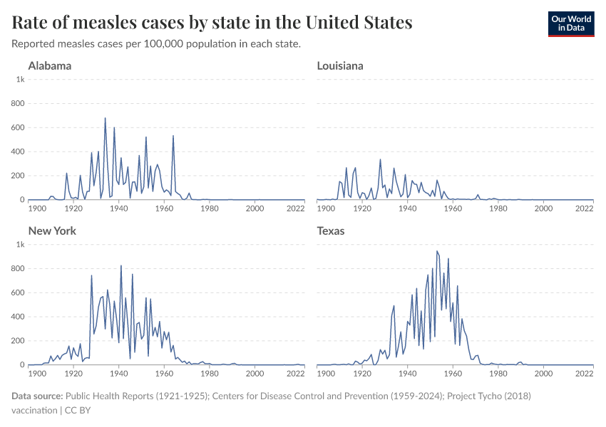 Public Health Reports (1921-1925); Centers for Disease Control and Prevention (1959-2024); Project Tycho (2018) – with major processing by Our World in Data. “Rate of measles cases by state in the United States” [dataset]. Project Tycho, “Project Tycho - Measles cases”; Centers for Disease Prevention and Control, “CDC Summary of Notifiable Infectious Diseases - Measles”; Centers for Disease Control and Prevention, “Reported measles cases - CDC”; Centers for Disease Control and Prevention, “National Notifiable Diseases Surveillance System - Measles”; U.S. Census Bureau, “Annual Estimates of the Population for each of the States in the USA” [original data]. Retrieved June 5, 2025 from https://wdi-citations.owid.pages.dev/grapher/reported-measles-case-rate-by-state-in-the-united-states