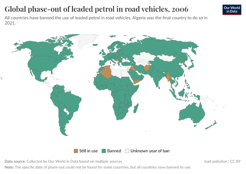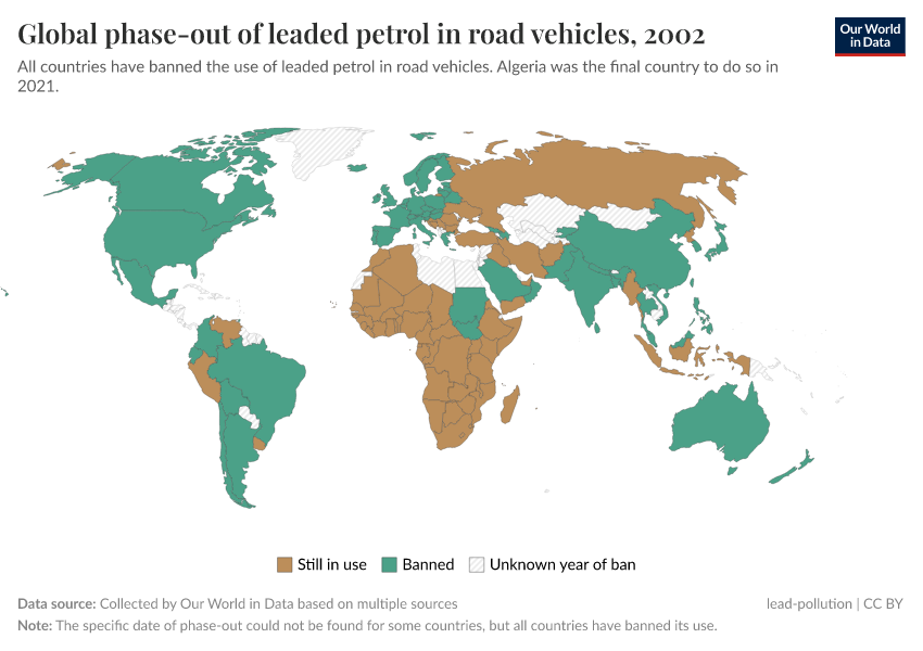 It took long to react, but once the evidence was there and the first country banned it is staggering how quickly some of this progress was made. In 2002, the United Nations Environment Programme (UNEP) launched a programme to eliminate leaded gasoline in road vehicles globally.5 In the map below we see the status of leaded gasoline in Sub-Saharan Africa in 2002. It was still in use in nearly every country. By 2006, it had been banned everywhere in the region. Within only a few years it had been completely eliminated.