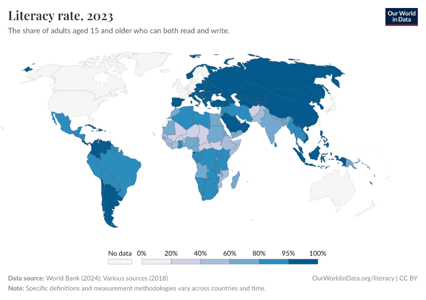 Of the world population older than 15 years, the majority are literate. This interactive map shows how literacy rates vary around the world.