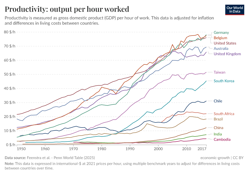 The chart here shows the growth in labor productivity, not just for agriculture but for the entire economy. The technological, economic, and social structures in richer countries have enabled workers there to produce more while working less.