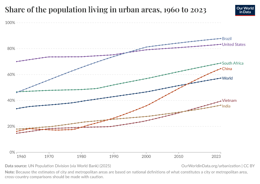 But this is changing quickly. You can see how urbanization rates are changing with time using the "Edit countries and regions" toggle on the interactive chart. For many countries, you see a rapid migration of populations into towns and cities.