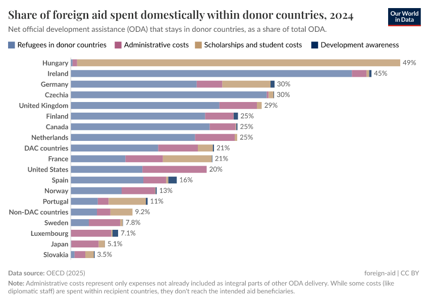 Another element that may be surprising is student scholarships — these can count as aid when they align with the host country's development plans.12 For most countries, this contribution is very small. But there are a few exceptions. Hungary is the most extreme case: it uses 41% of its aid budget for foreign students. In addition to refugee support and scholarships, aid money spent domestically includes funding for development awareness programs and administrative costs not already incorporated into specific aid initiatives.